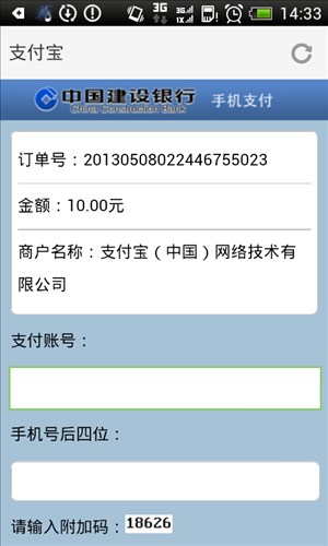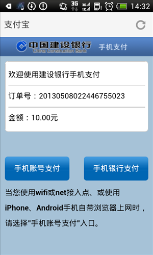 1.您通过手机在商户网站进行支付,选择建行手机支付,系统会自动跳转至我行的手机银行支付页面,您可以点击“手机银行支付”。