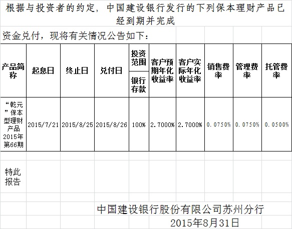 中国建设银行苏州分行保本理财产品2015年第66期理财产品兑付公告